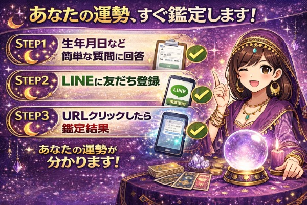 難しい専門知識や、複雑な操作は一切不要です。どなたでも簡単に答えられるシンプルな質問に回答いただくだけで、あなたの運命を分析し、最適なアドバイスを導き出します。